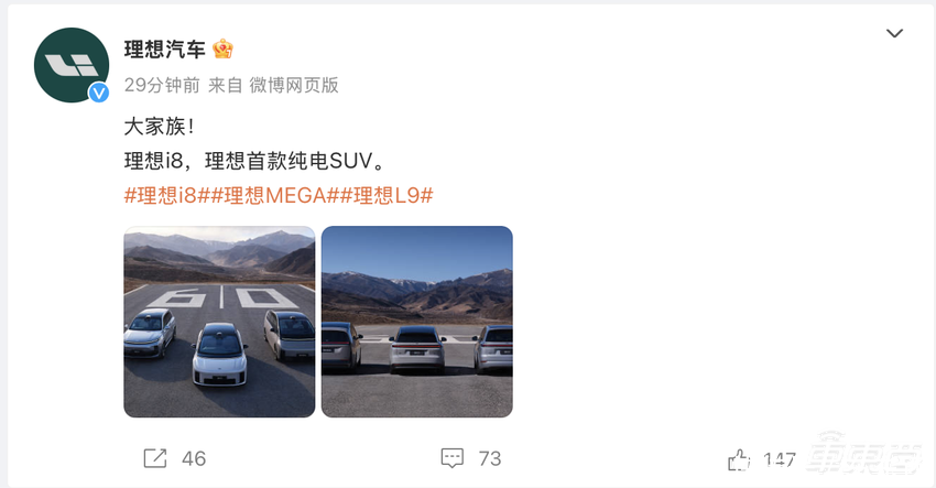 车东西2月25日消息,就在刚刚,理想正式公布了其首款纯电SUV理想i8的官方图片。
